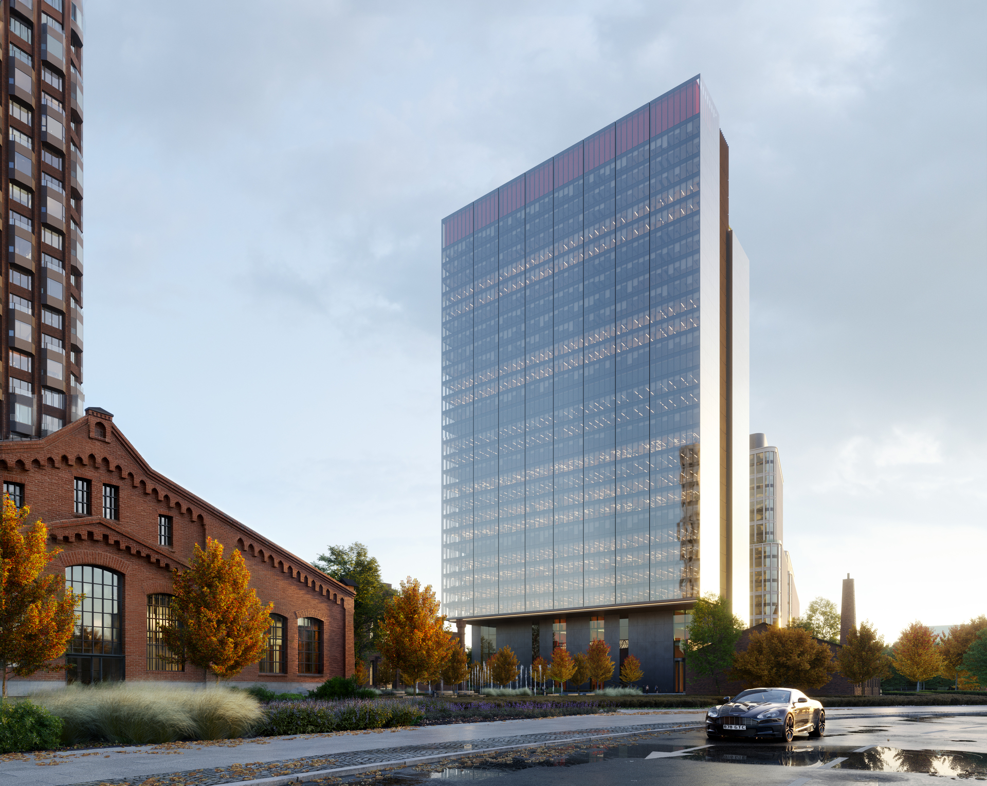 Первоначально проект задумывался как цельная башня прямоугольной формы, однако позже здание было разделено на три вертикальных сегмента, что придало фасаду лёгкость и визуальную динамику, сохранив при этом целостность композиции.