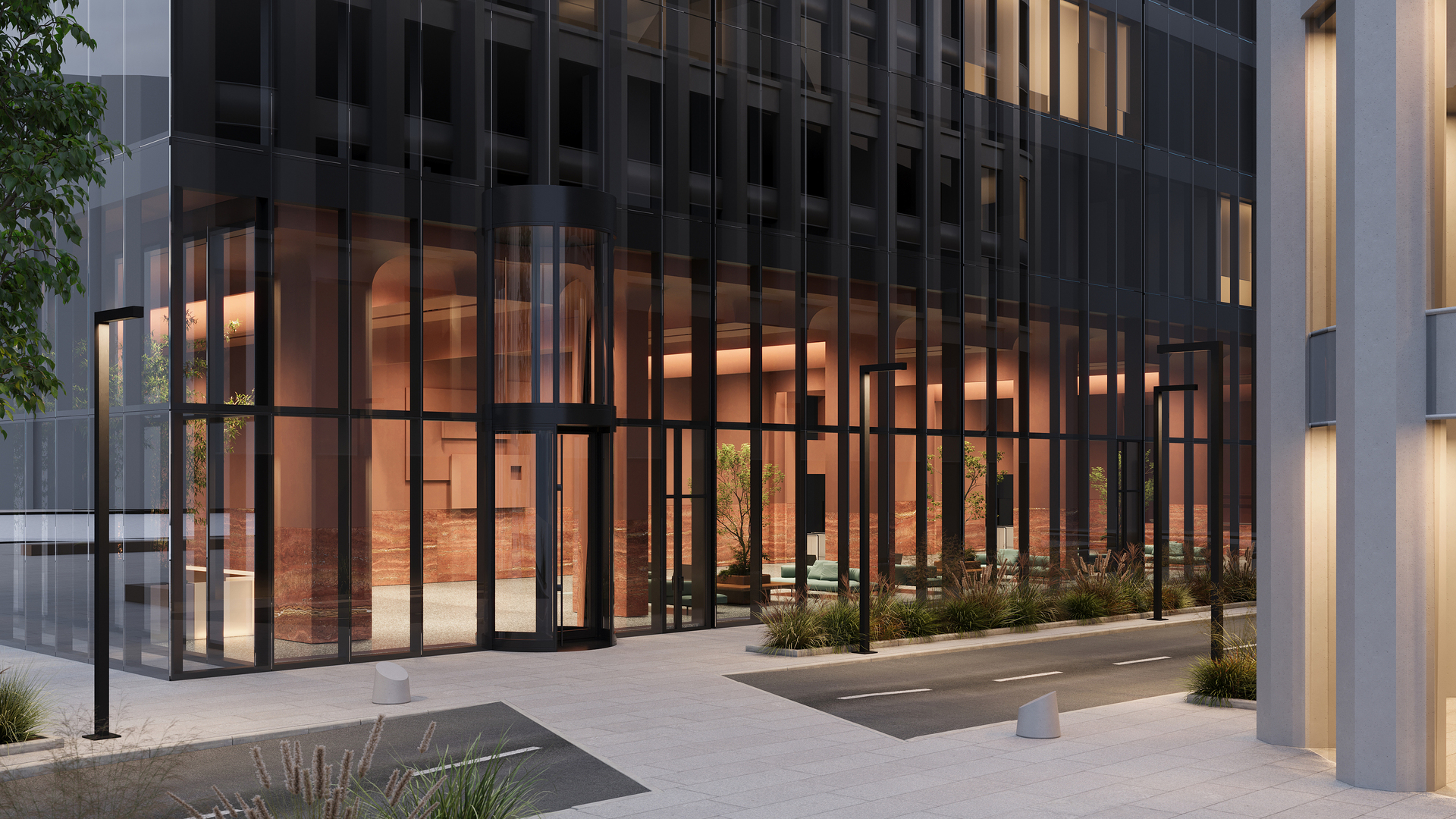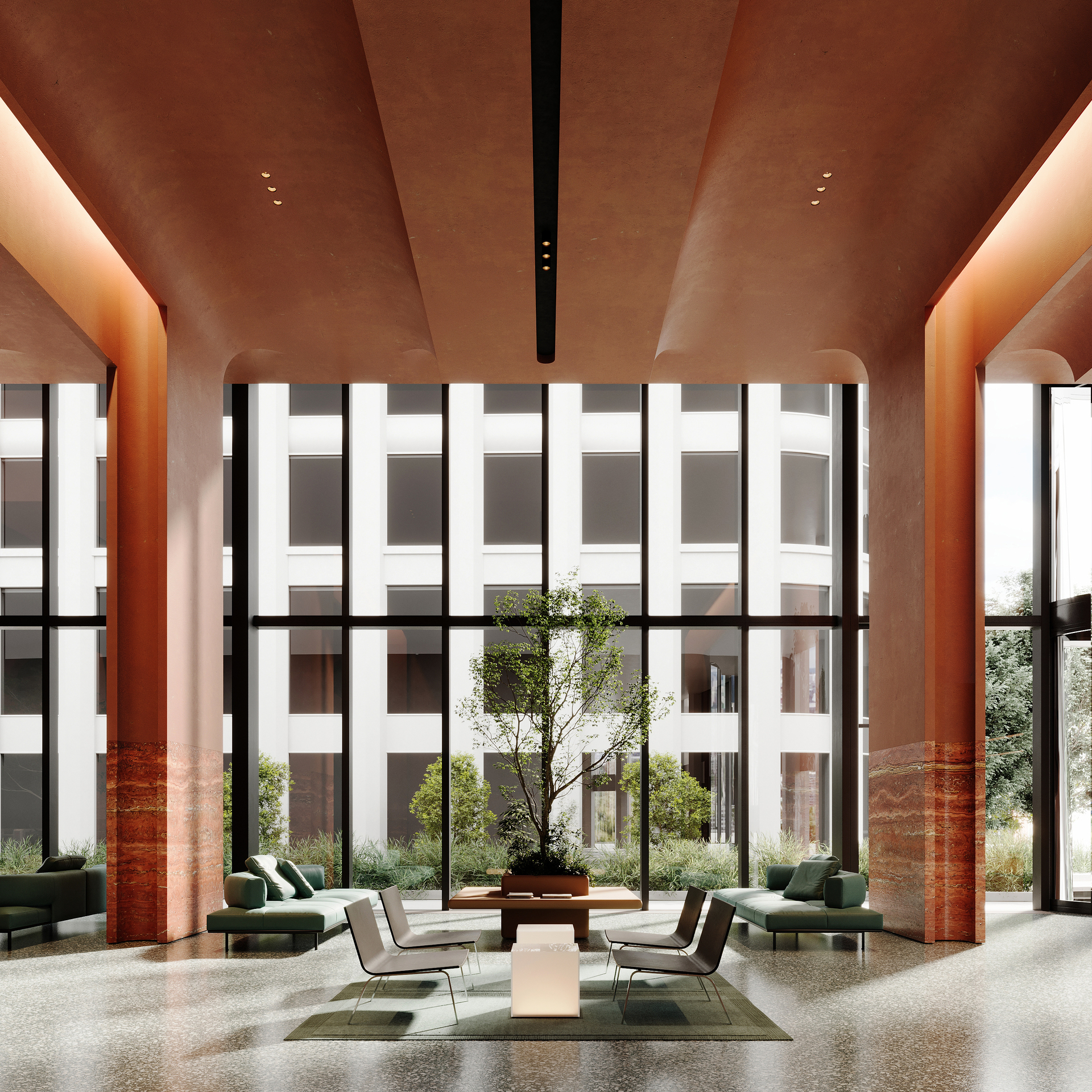Высота потолков в лобби достигает 7,8 метра, а панорамное остекление наполняет двусветное пространство светом и воздухом.