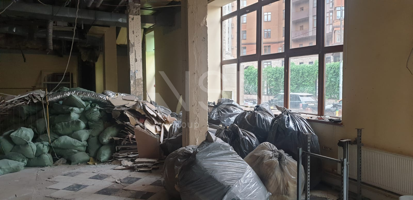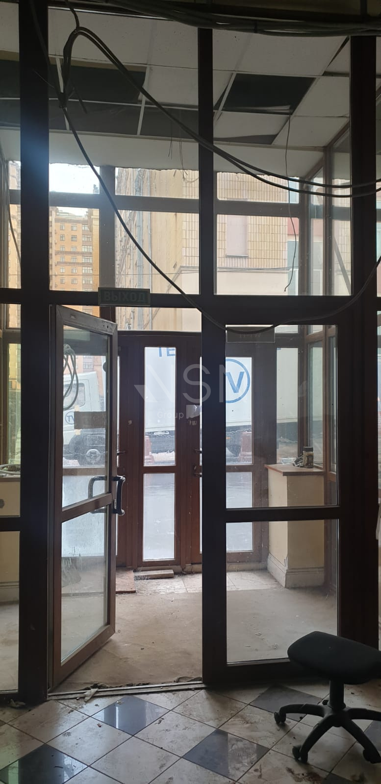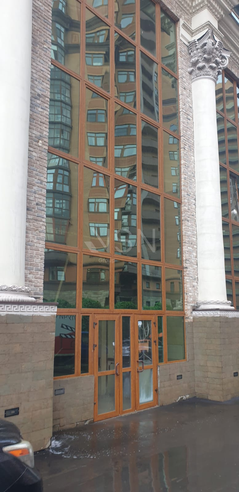 Высокий цокольный этаж, витринные окна.