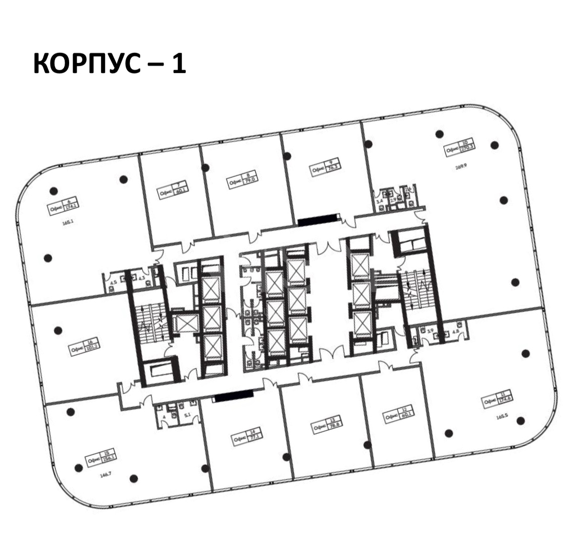 - Высота потолков: лобби 8 м, офисные этажи 3.95.