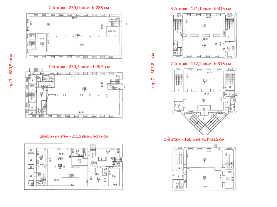 Стр.3: 1-й этаж- 230,4 кв.м., h-3,01 м, 2-й этаж - 239,0 кв.м. h-2,88 м, Цокольный этаж - 211,1 кв.м., h-2,72 м