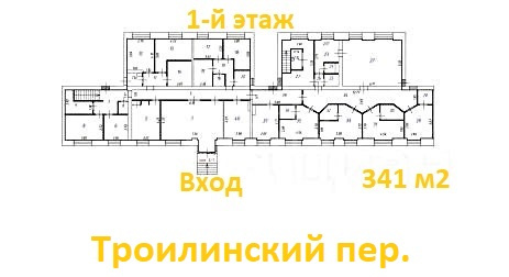 1-й этаж 341 м2, цокольный этаж 287,9 м2.