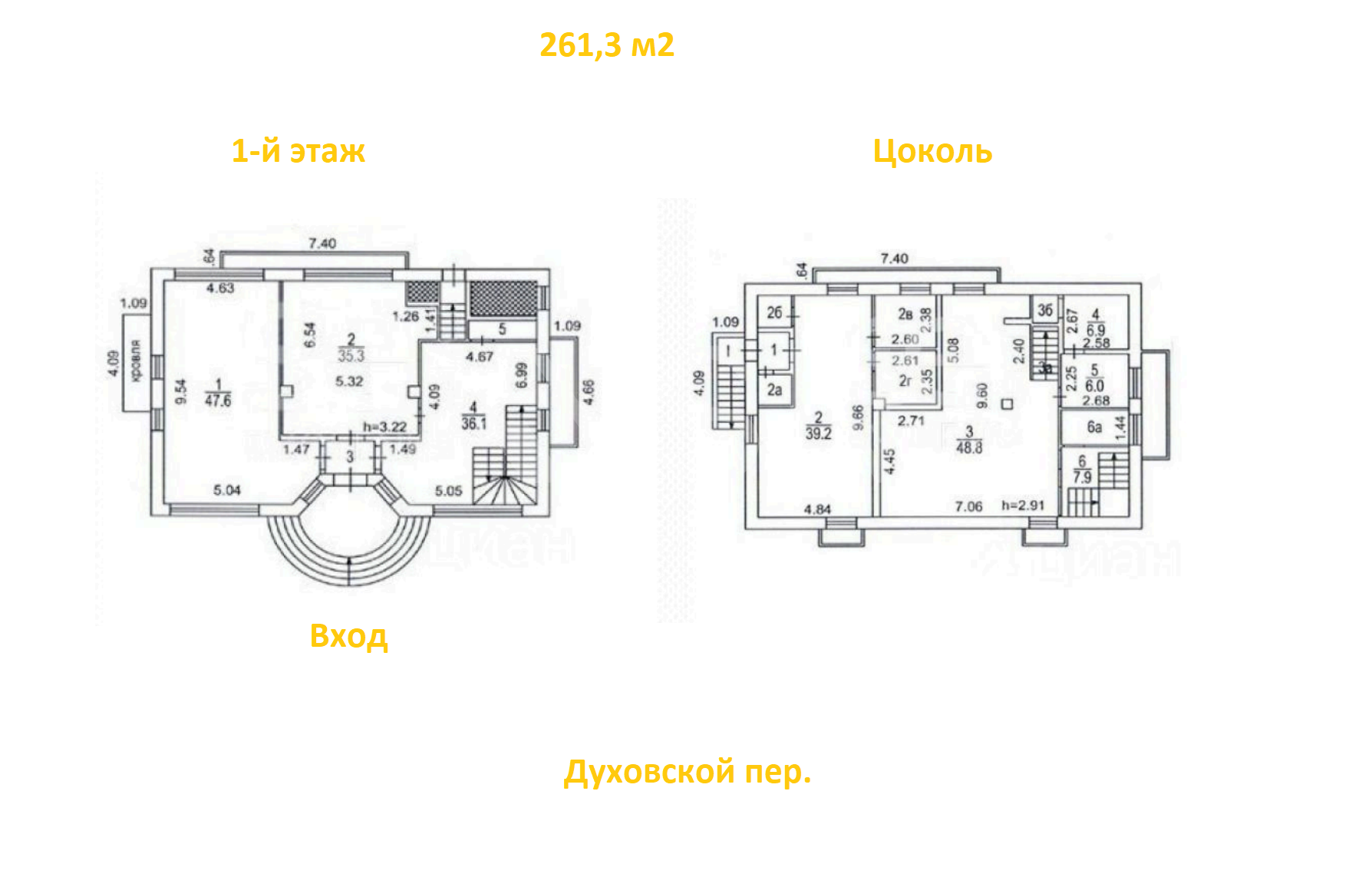 1-й и цоколь 261,3 м3, 2-й этаж 133,2 м2. Два отдельный входа.