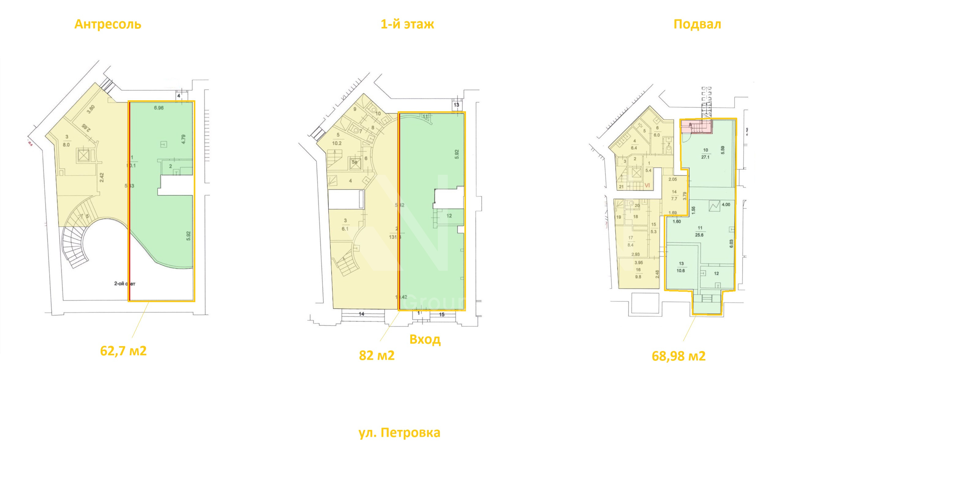 1-й этаж 82 м2, антресоль 62,7 м2, подвал 68,98 м2, 1-я линия домов.