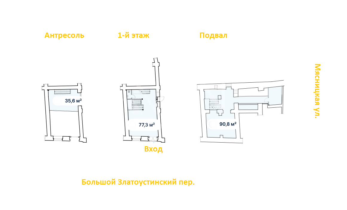 1-й этаж 77,3 м2, антресоль 35,6 м2, подвал 90,8 м2.