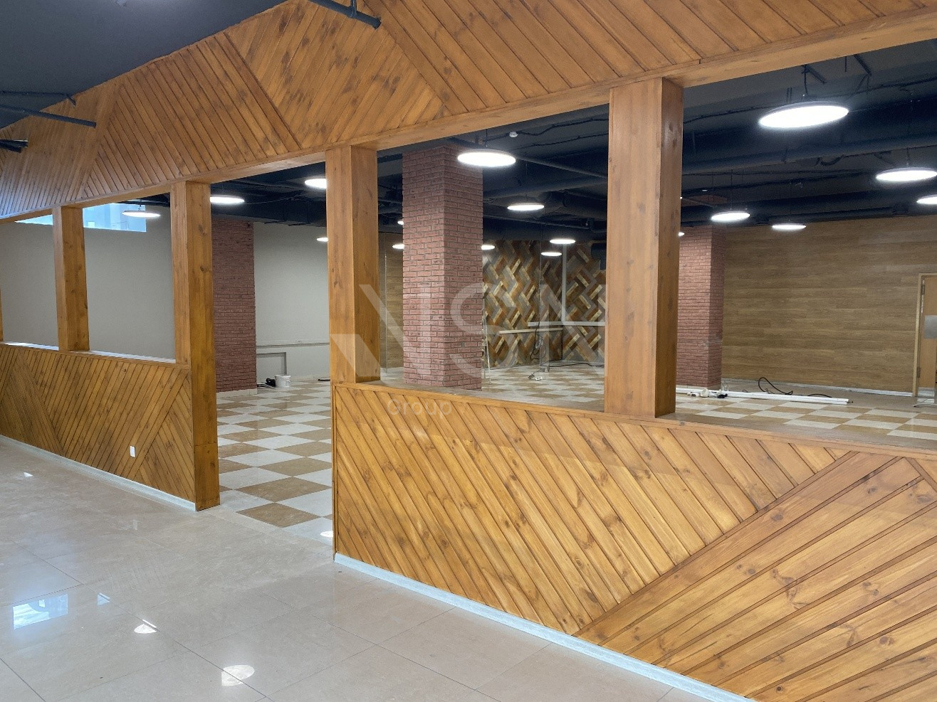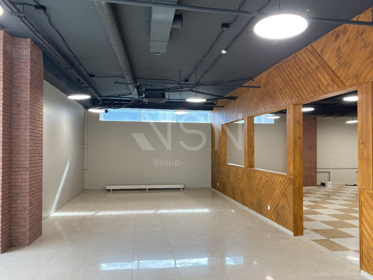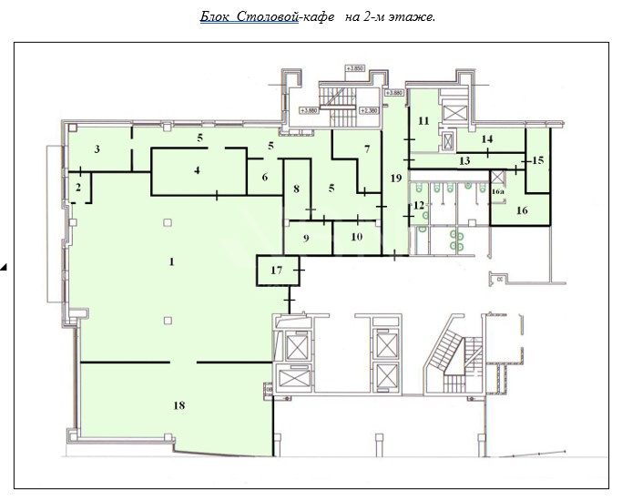 2-й этаж 435 м2. Два зала, кухня, подсобные помещения, склад, душевые для сотрудников и с/у.