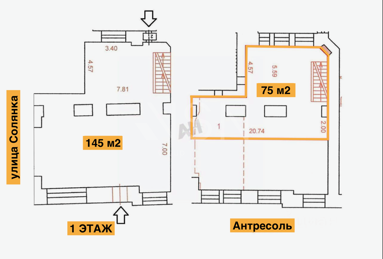 1-й этаж: 145 м2, антресоль: 75 м2.