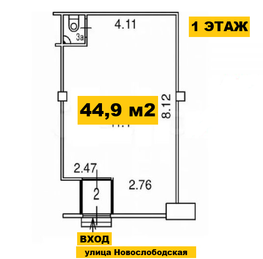 Площадь помещения 44,9 м2.