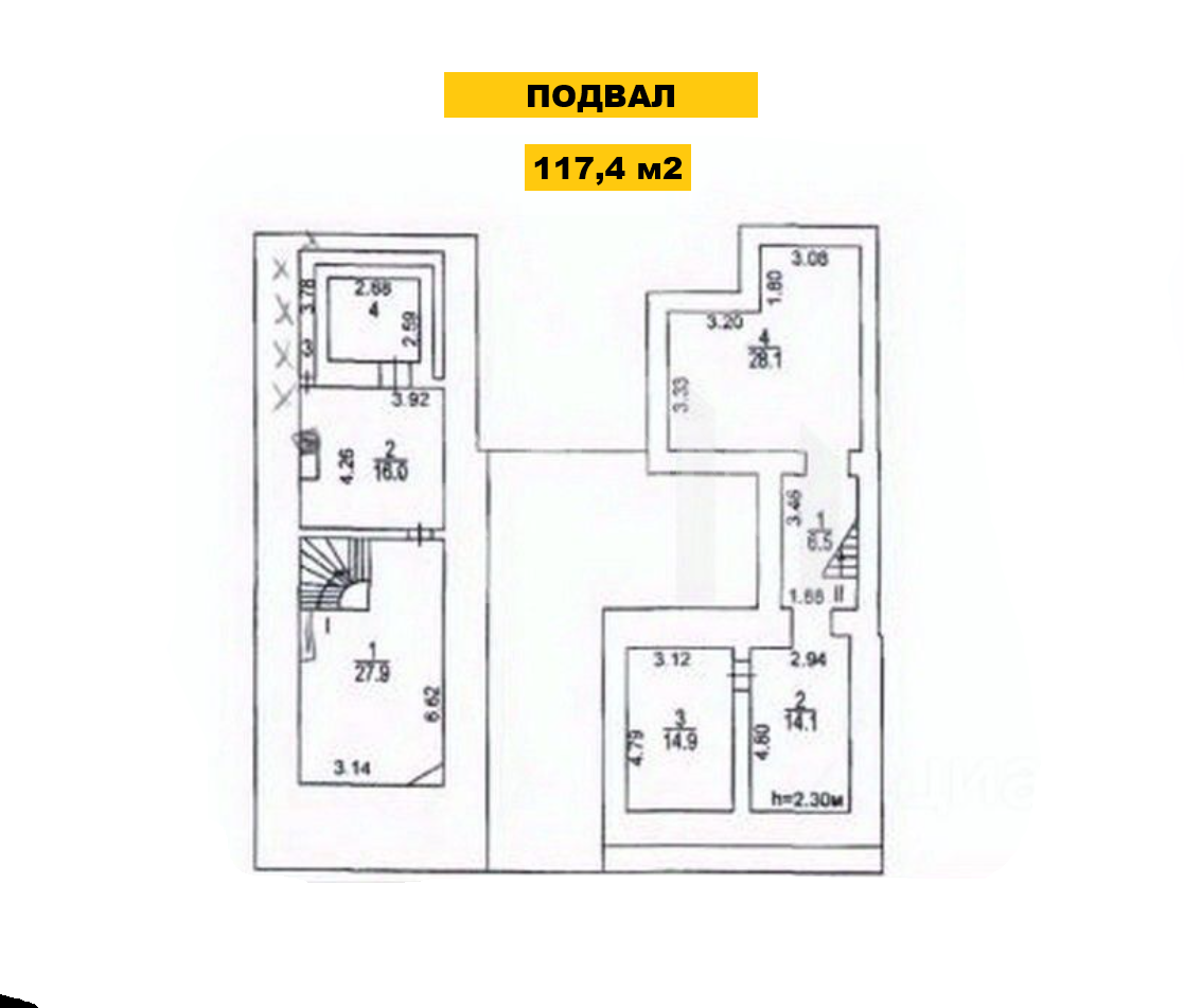 1-й этаж: 234,5 м2, 2-й этаж: 230,9 м2, 3-й этаж: 220,3 м2. Подвал: 117,4 м2.