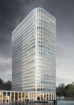 Архитектурное бюро «KLEINEWELT» подготовило ультрасовременный проект премиального бизнес-центра с лаконичным дизайном и современными материалами.