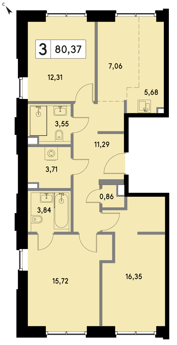 Представляем вашему вниманию 3-комнатная квартира с отделкой на 35 этаже, Корпус H.