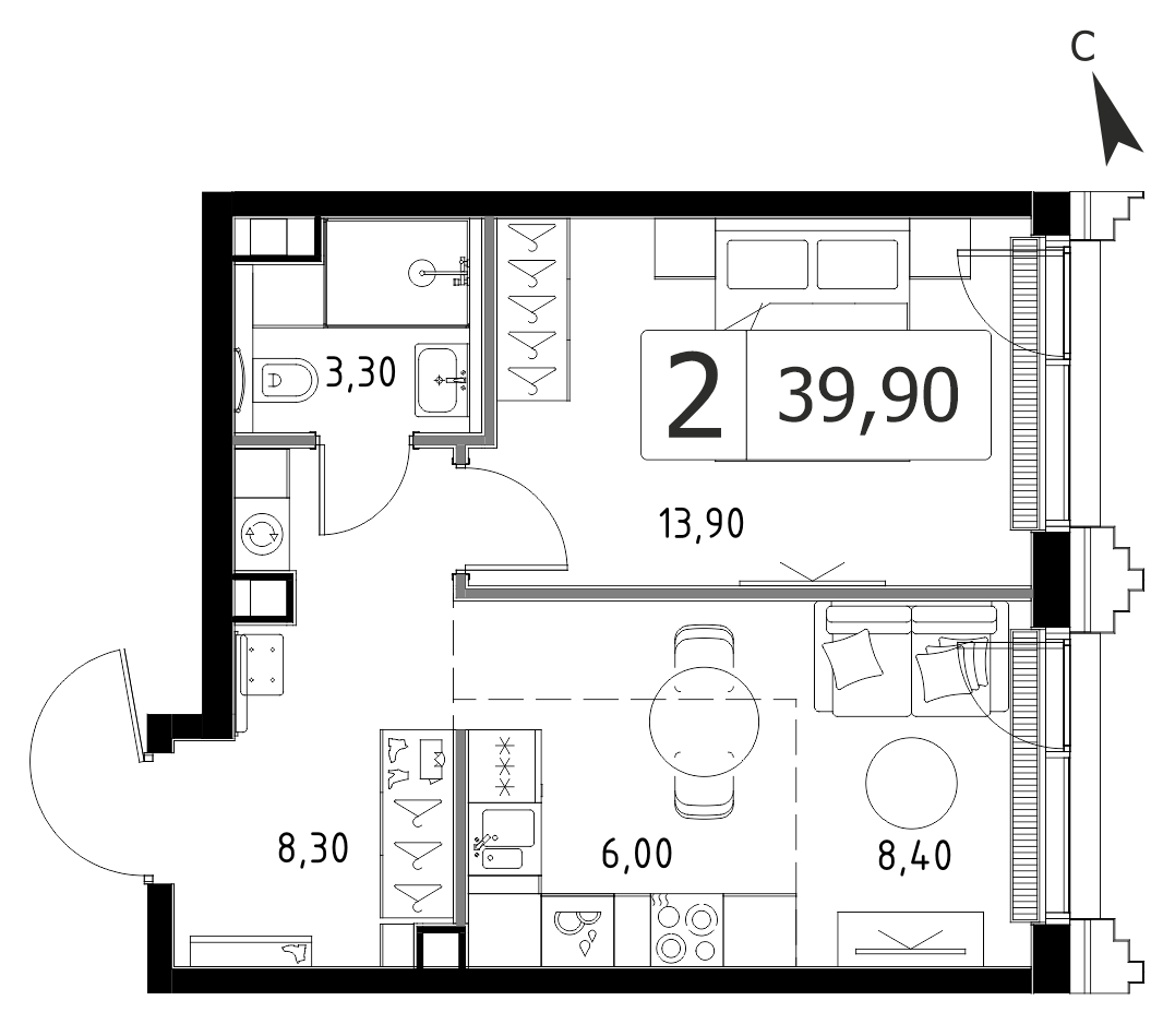 В продаже 2-комнатная квартира без отделки на 32 этаже, Корпус 1.