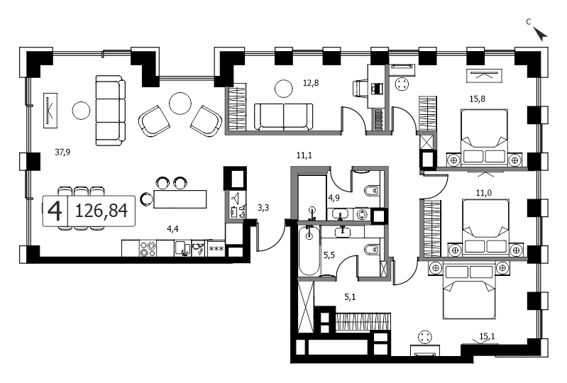Представляем вашему вниманию 3-комнатная квартира без отделки на 5 этаже, Корпус 1.