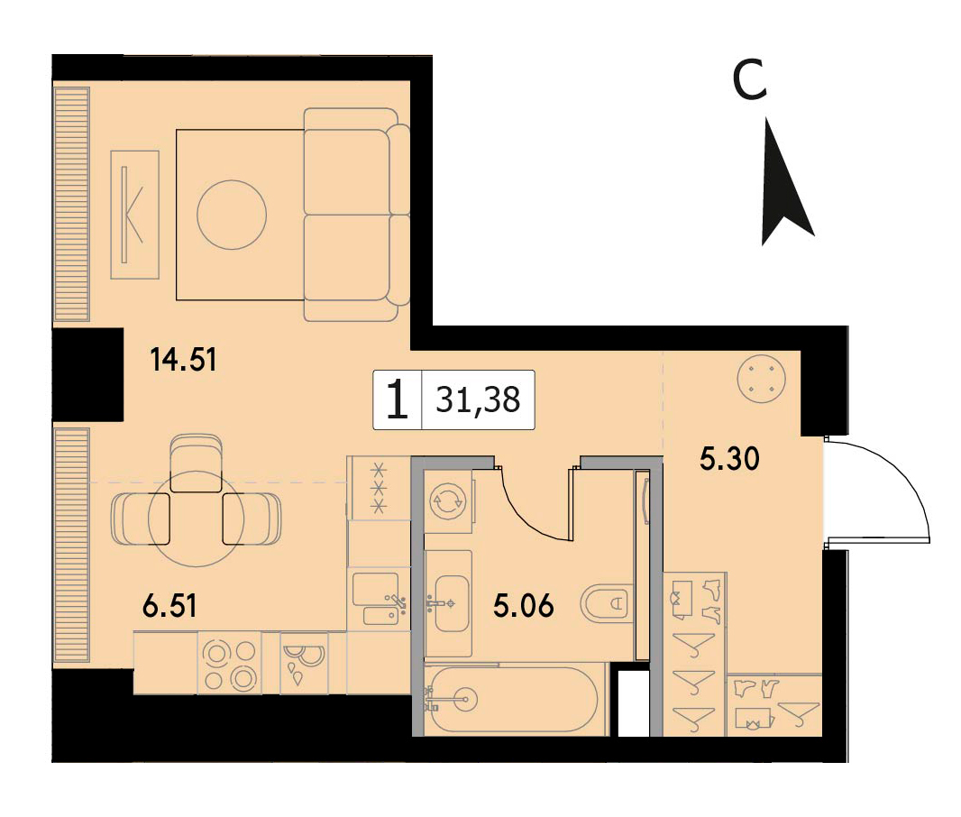 В продаже 1-комнатная квартира без отделки на 30 этаже, Корпус А.