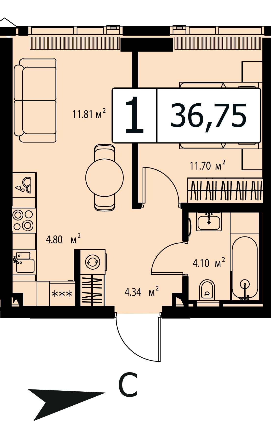 В продаже 1-комнатная квартира без отделки на 30 этаже, К1.