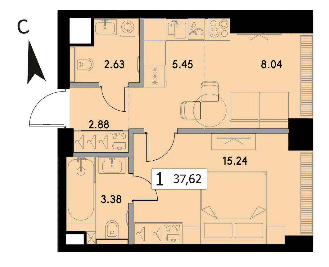 В продаже 1-комнатная квартира без отделки на 23 этаже, Корпус 1.3.