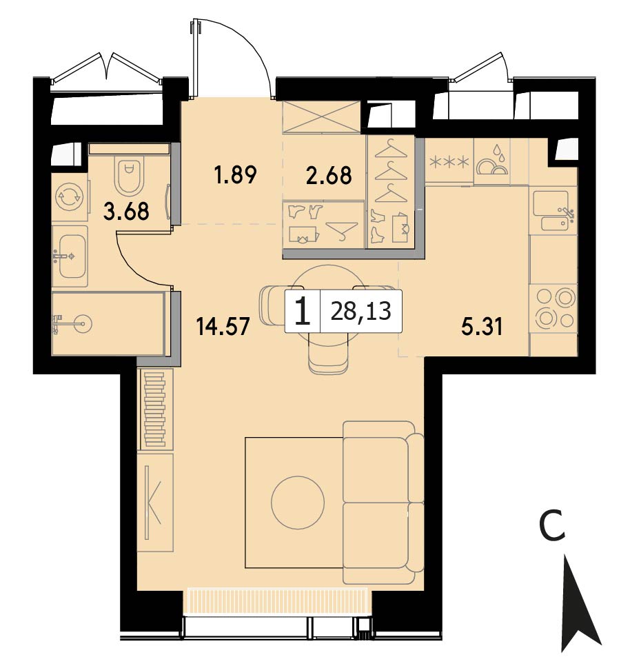 В продаже 1-комнатная квартира без отделки на 8 этаже, Корпус 1.