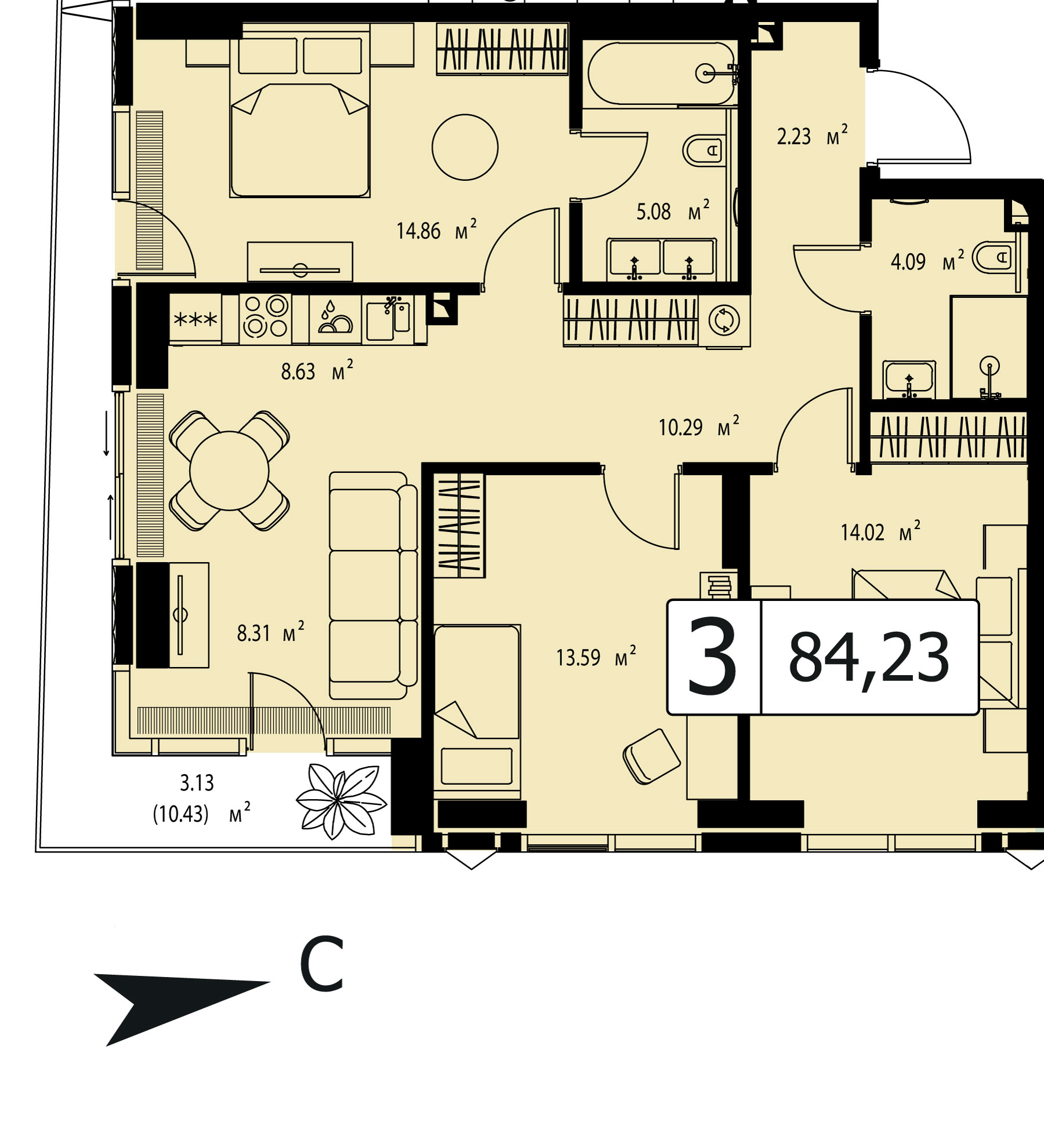 Представляем вашему вниманию 3-комнатная квартира без отделки у метро Улица 1905 года на 2 этаже, Корпус F. Роскошный квартал Life Time дарит время для жизни.