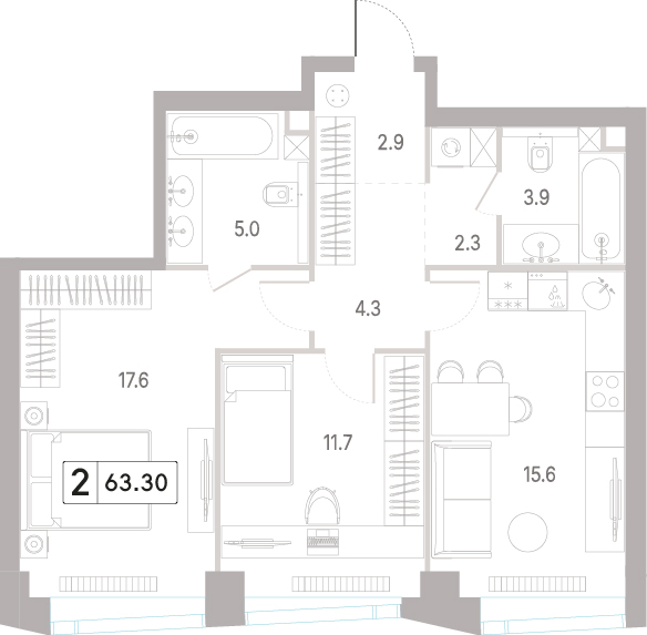 В продаже 2-комнатная квартира без отделки на 40 этаже, Корпус 5.