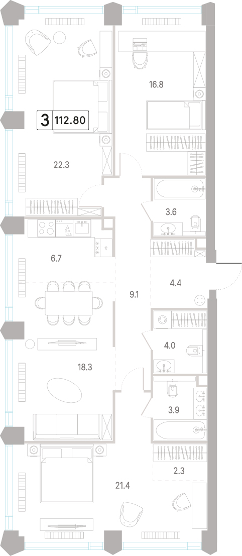 4-комнатная квартира с отделкой на 7 этаже, Корпус 3.