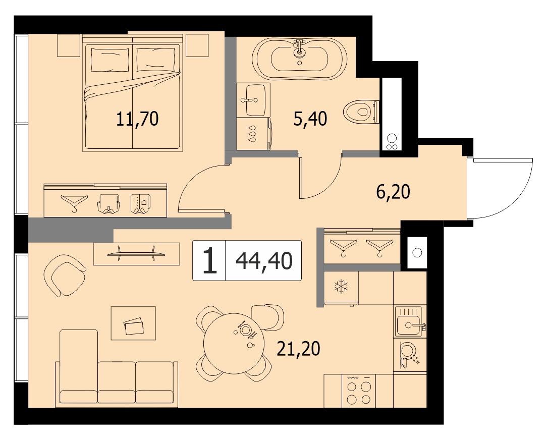 Однокомнатная квартира 42.88м², 21 этаж