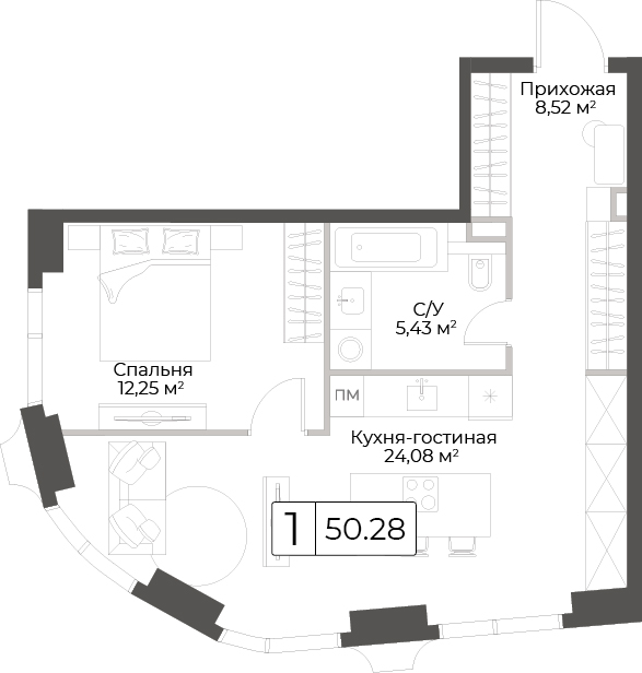 В продаже 1-комнатная квартира без отделки на 7 этаже, Корпус 1.
