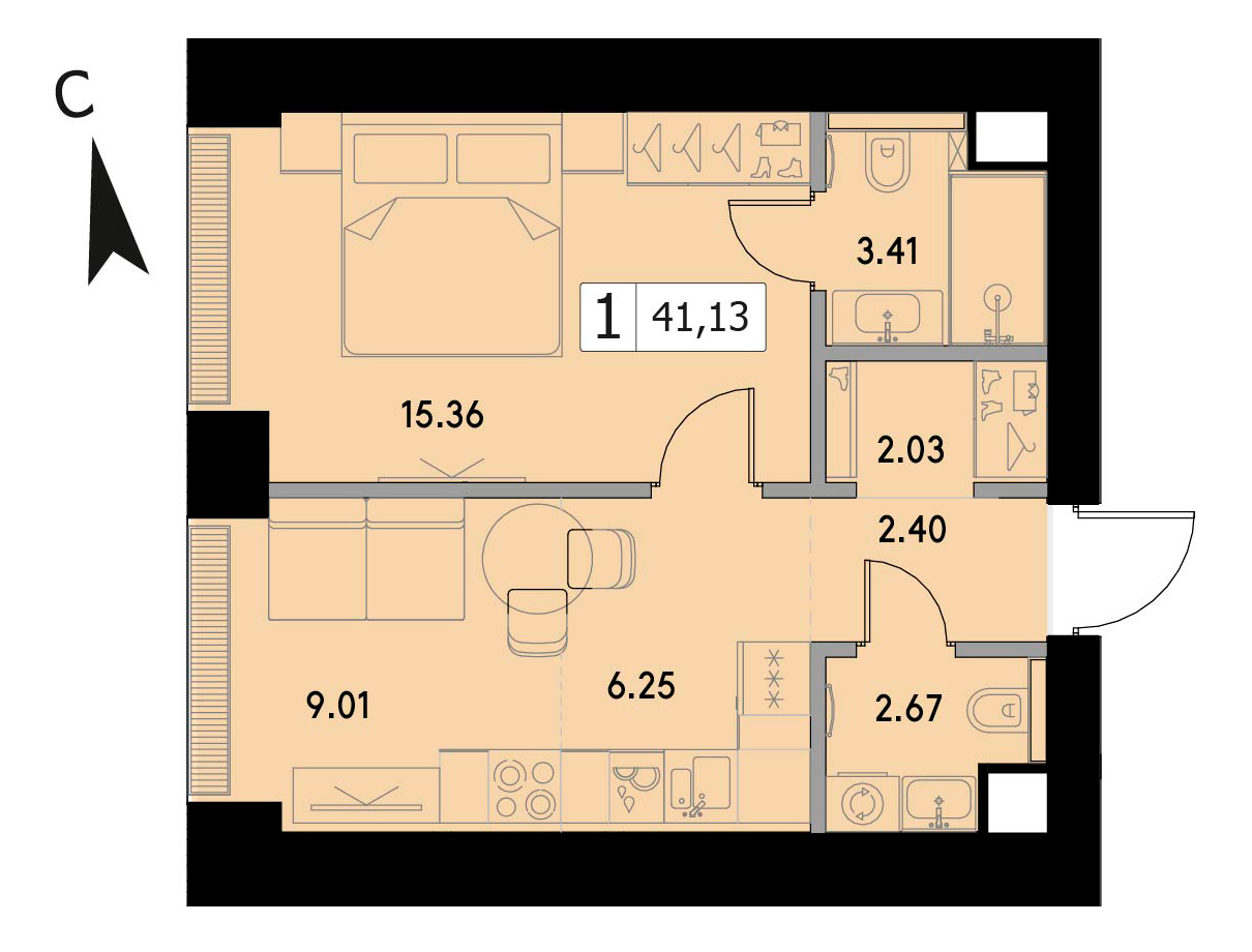 В продаже 1-комнатная квартира без отделки на 6 этаже, Корпус 1.2.
