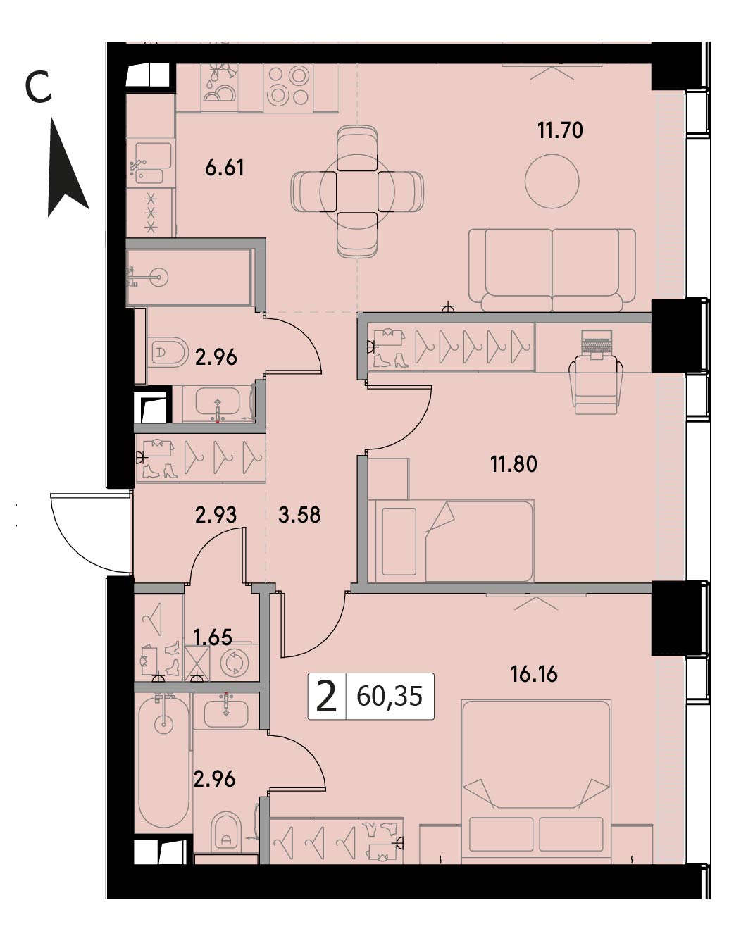 В продаже 2-комнатная квартира без отделки на 6 этаже, Корпус 1.