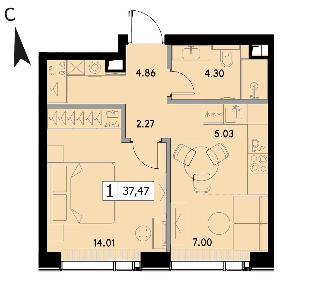 В продаже 1-комнатная квартира без отделки на 14 этаже, Корпус 6.1.