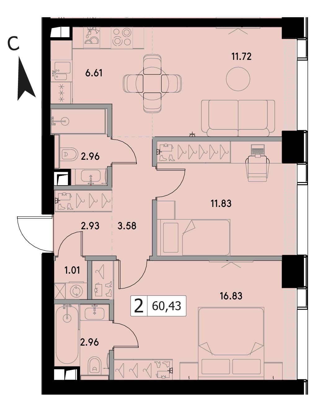 В продаже 2-комнатная квартира без отделки на 17 этаже, Корпус 1.5.