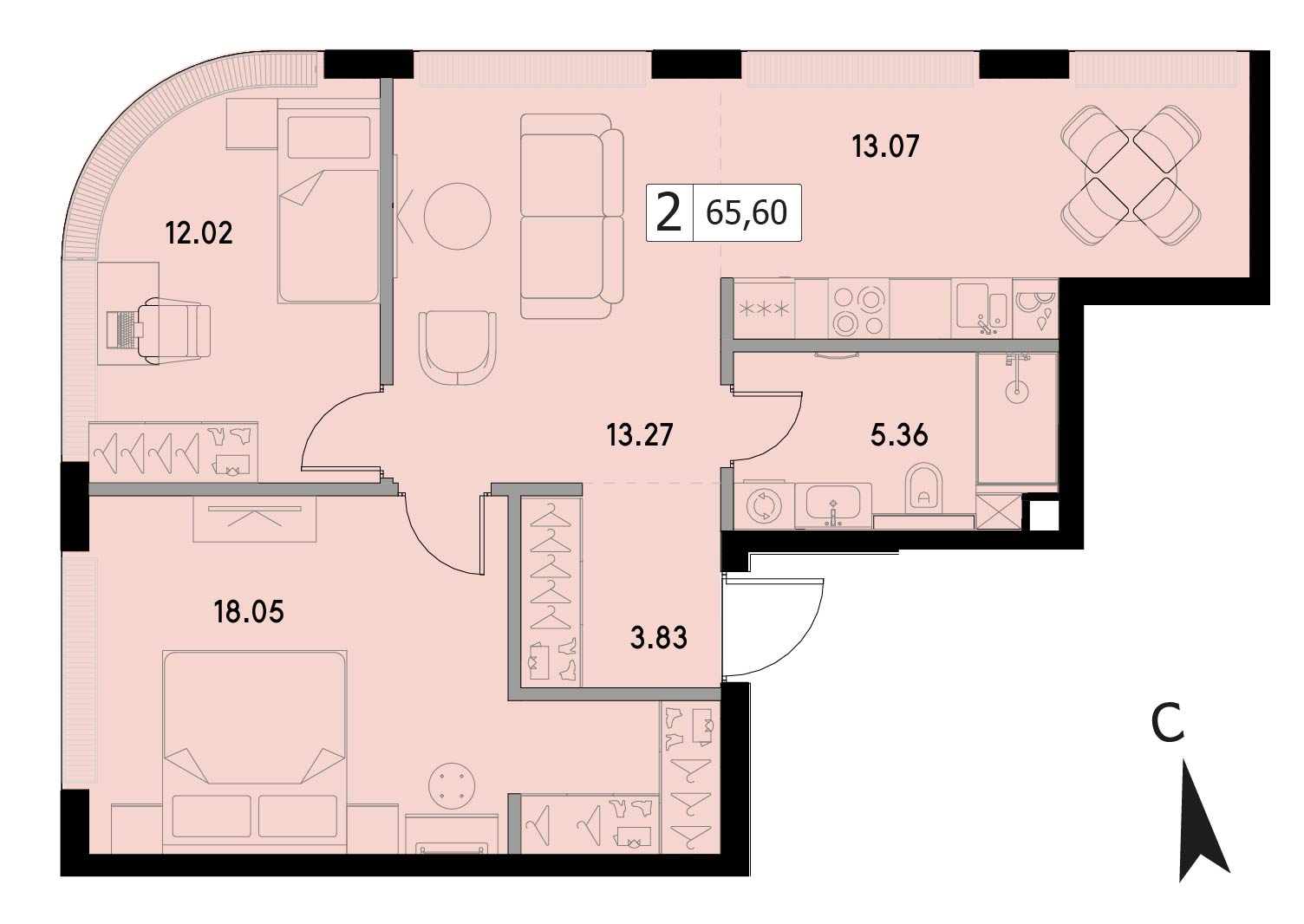 В продаже 2-комнатная квартира без отделки на 32 этаже, Корпус 1.2.