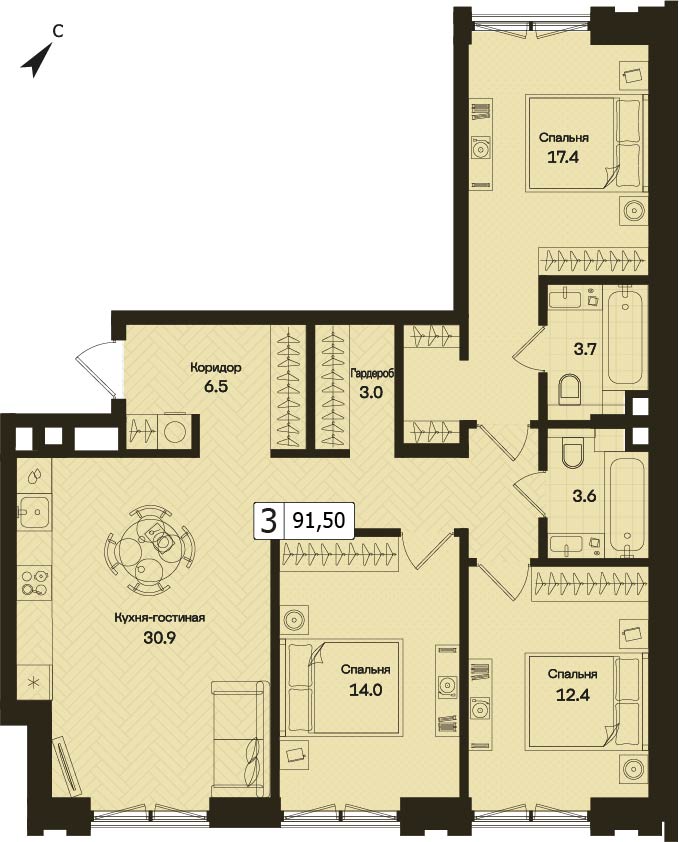 Представляем вашему вниманию 3-комнатная квартира без отделки на 14 этаже, Корпус 1.