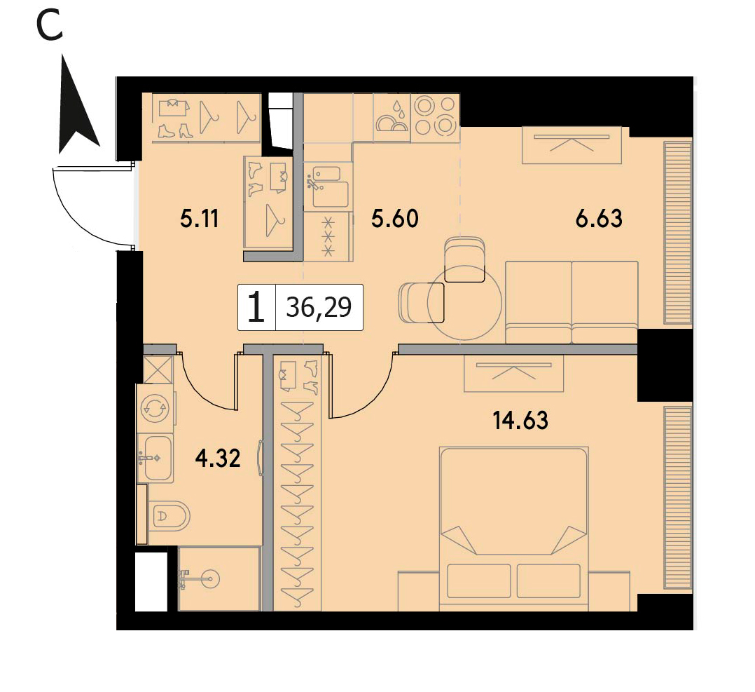 В продаже 1-комнатная квартира без отделки на 42 этаже, Корпус 5.