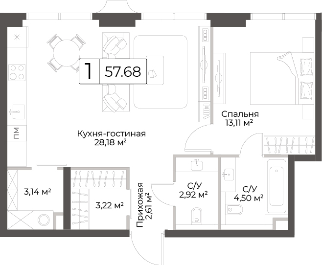 В продаже 1-комнатная квартира с отделкой на 39 этаже, Корпус 6.