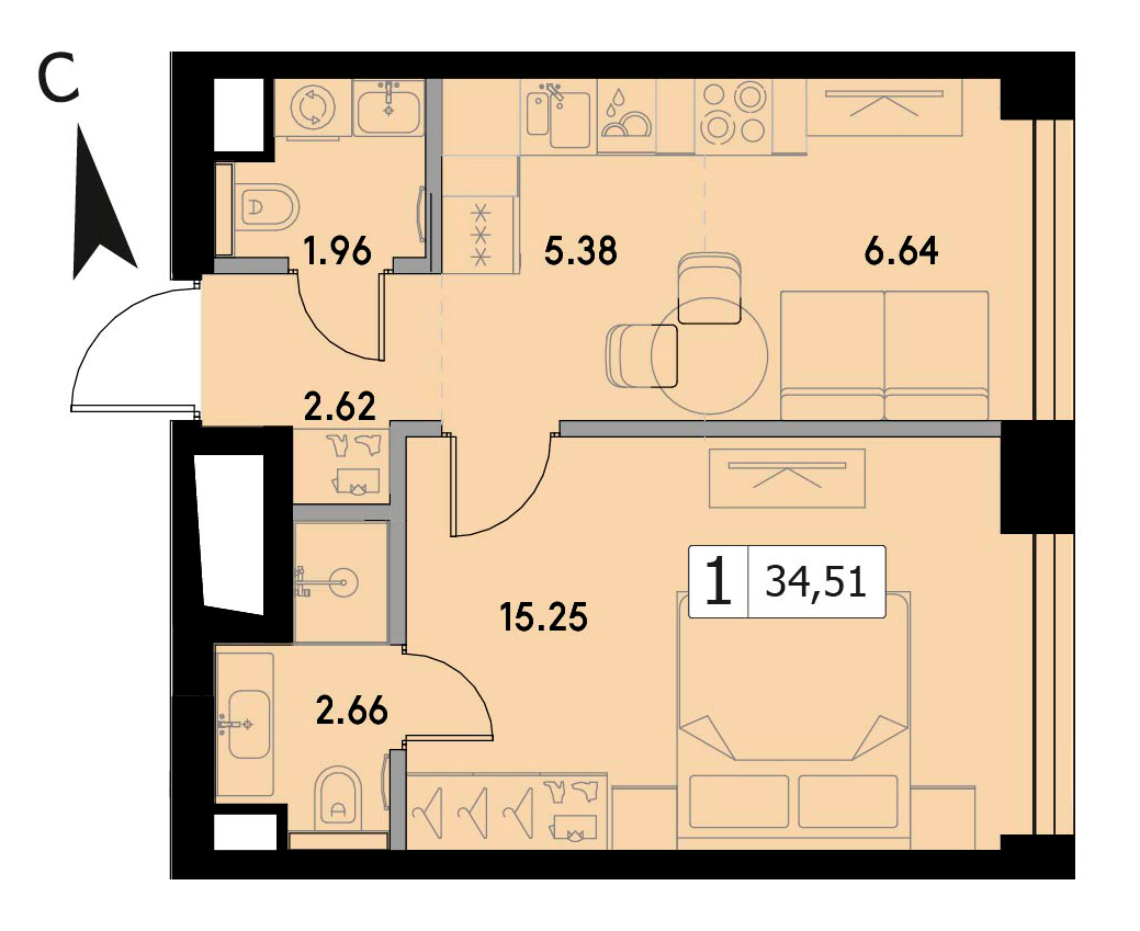 В продаже 1-комнатная квартира без отделки на 35 этаже, Корпус 1.3.