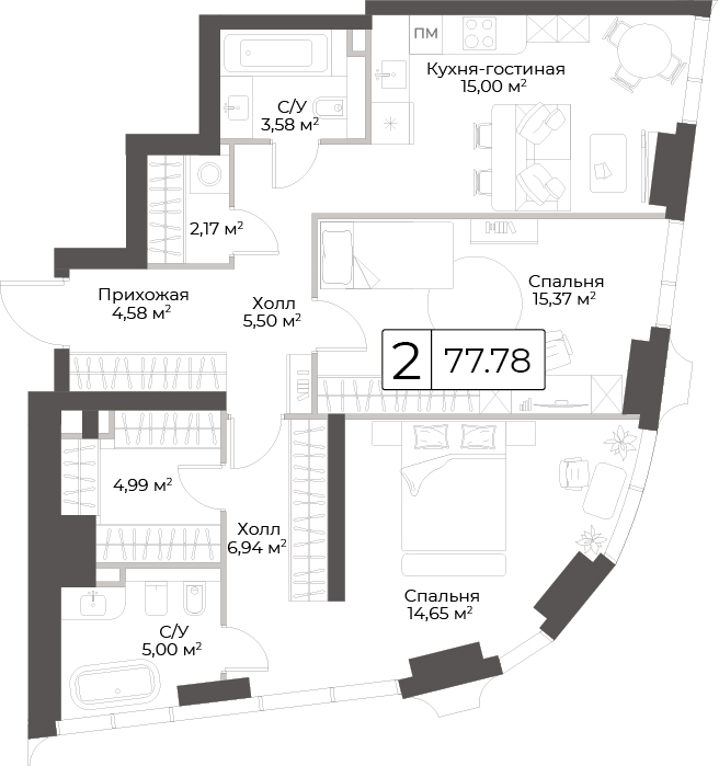В продаже 2-комнатная квартира без отделки на 12 этаже, Корпус 1. Официальный партнер Группы «Эталон».