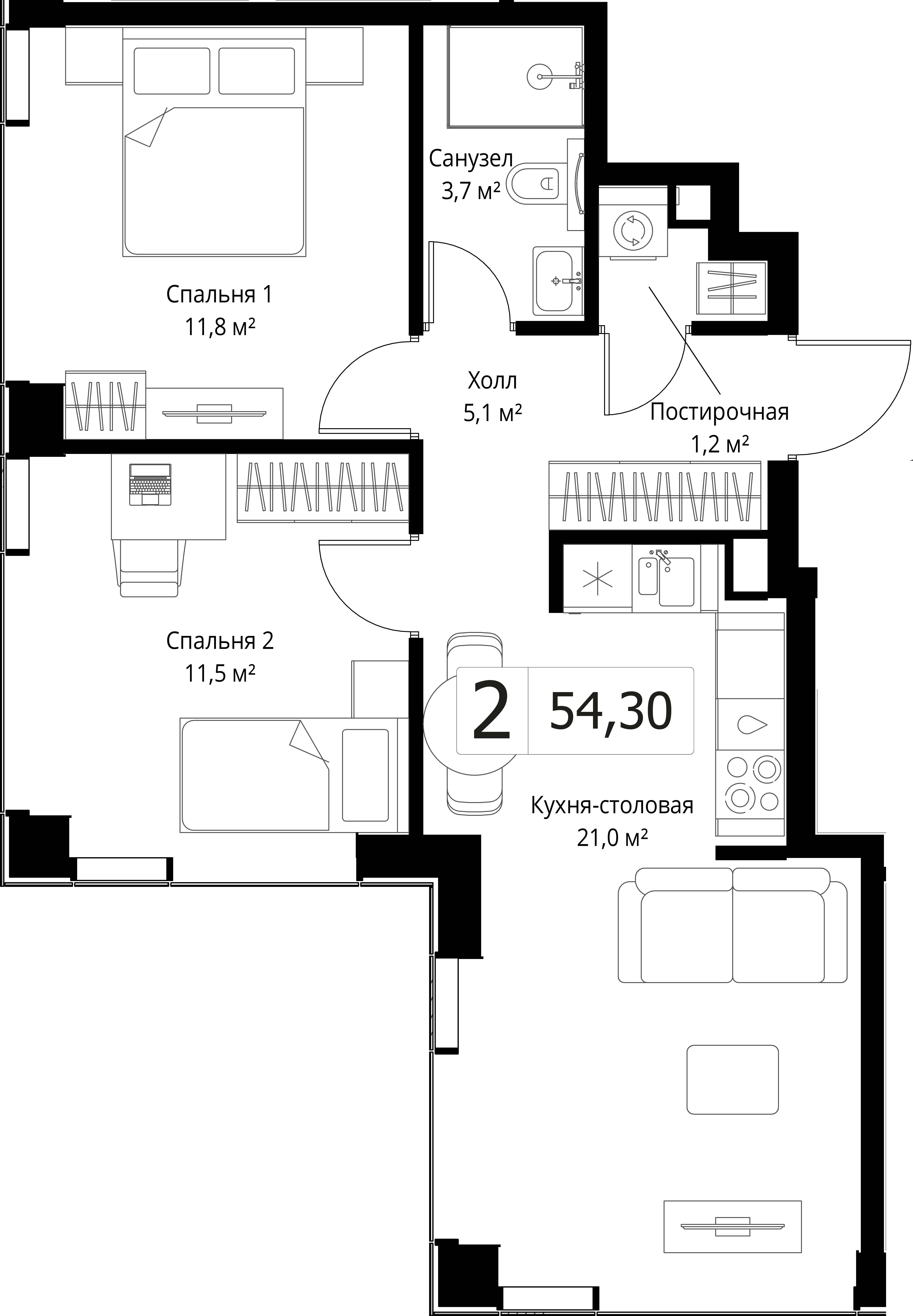 В продаже 2-комнатная квартира без отделки на 17 этаже, Корпус 1.3.