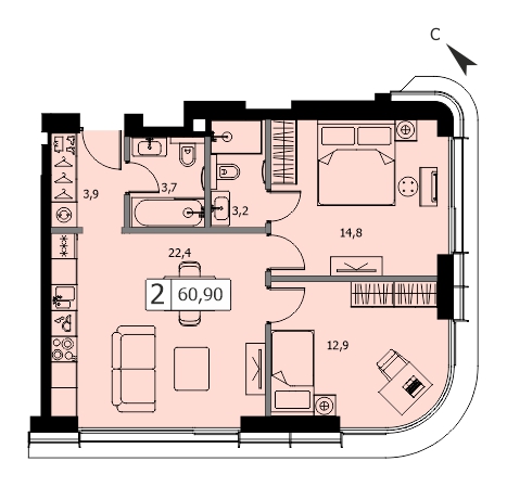 Представляем вашему вниманию 3-комнатная квартира без отделки на 14 этаже, Корпус 1.