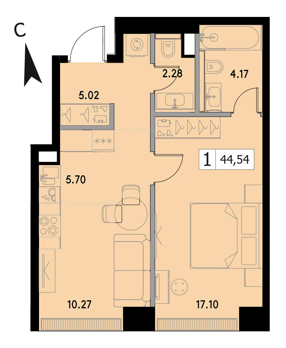 В продаже 2-комнатная квартира без отделки на 7 этаже, Корпус 1.