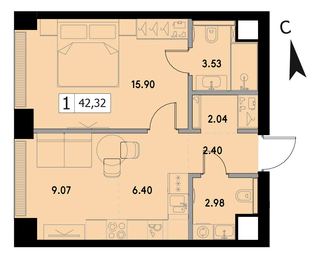 В продаже 1-комнатная квартира без отделки на 32 этаже, Корпус 1.3.