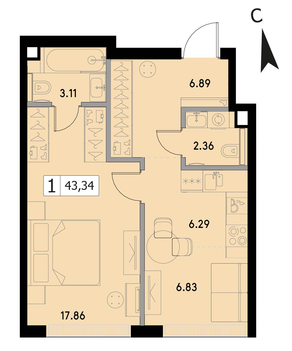 В продаже 1-комнатная квартира без отделки на 14 этаже, Корпус 1.2.
