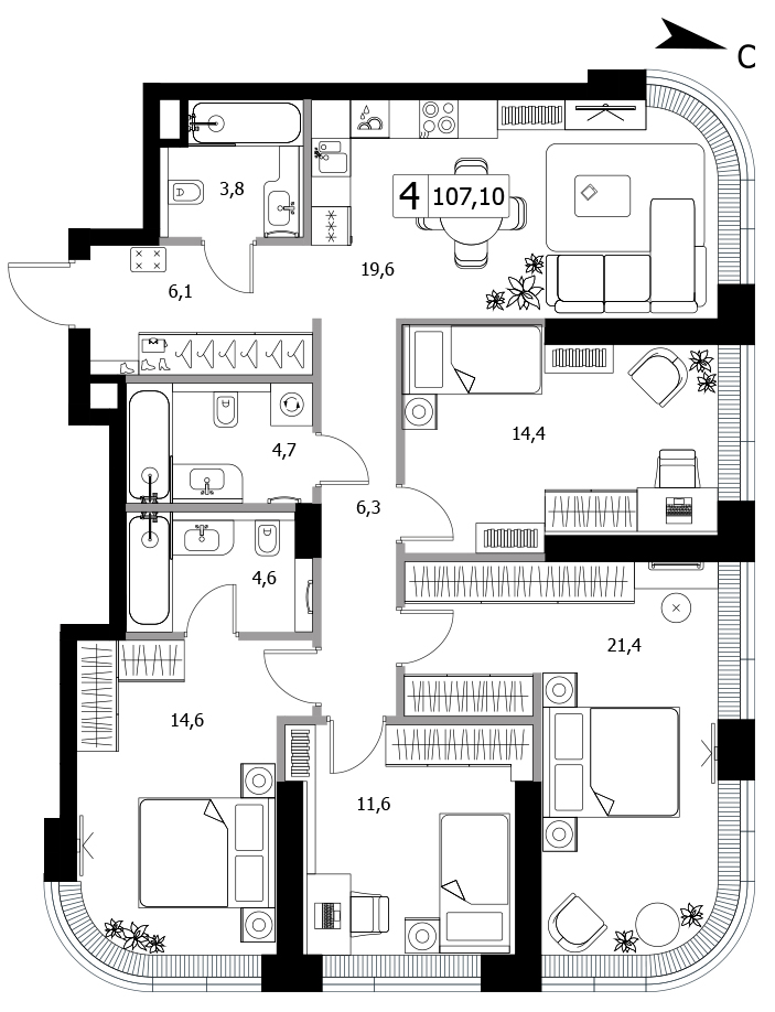 4-комнатная квартира без отделки у метро Тушинская на 21 этаже, Корпус 1.