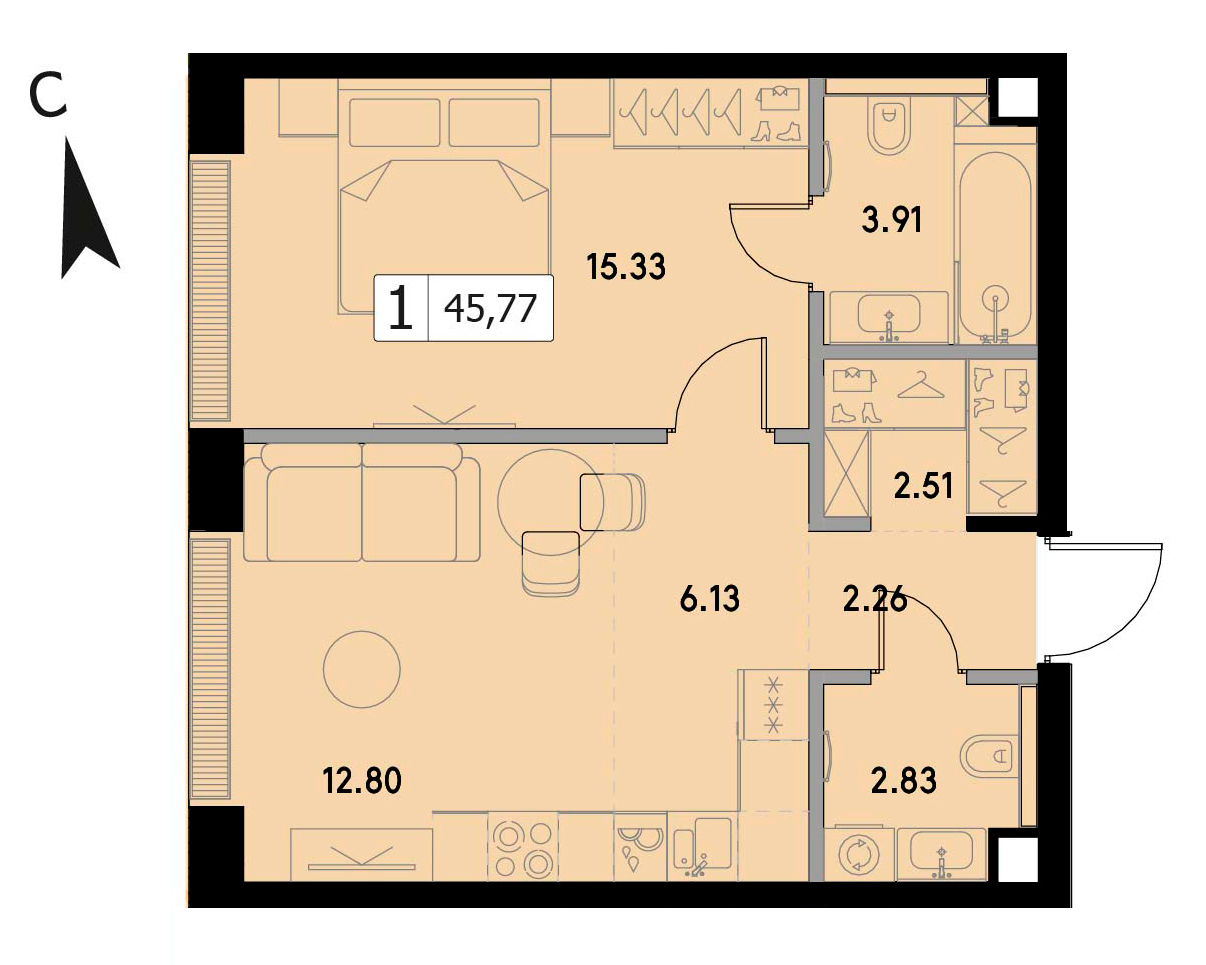 В продаже 1-комнатная квартира без отделки на 63 этаже, Корпус 1.3.