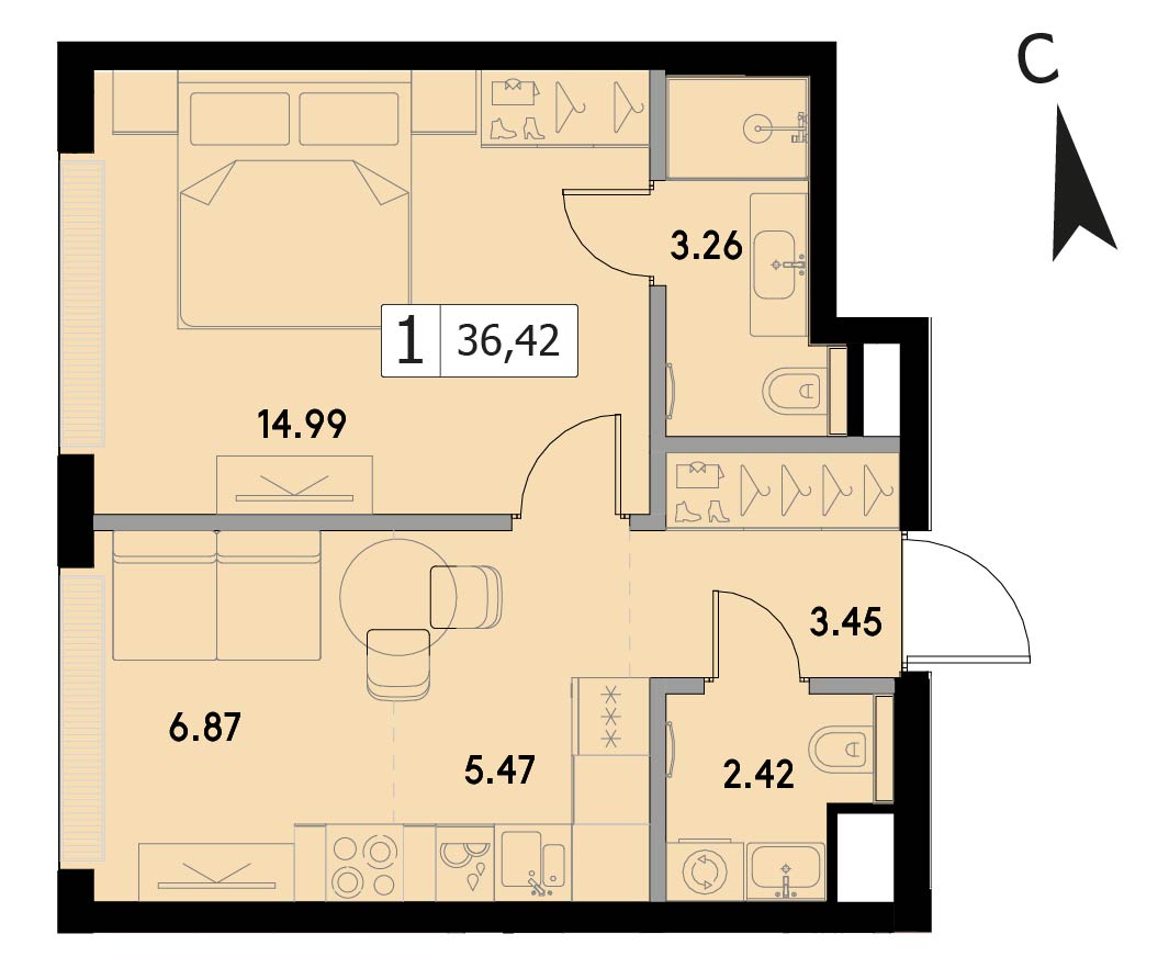 В продаже 1-комнатная квартира без отделки на 23 этаже, Корпус 1.2.