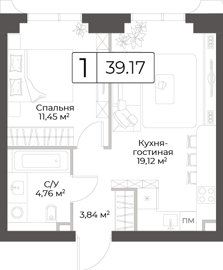 В продаже 1-комнатная квартира без отделки на 20 этаже, Корпус 1.