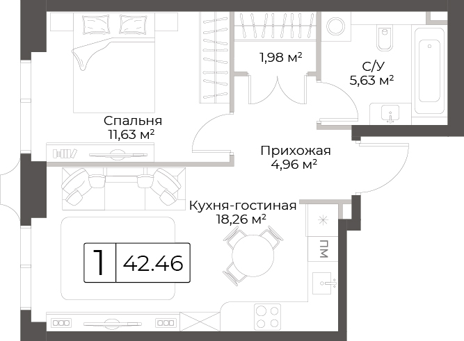 В продаже 1-комнатная квартира без отделки на 7 этаже, Корпус 1.