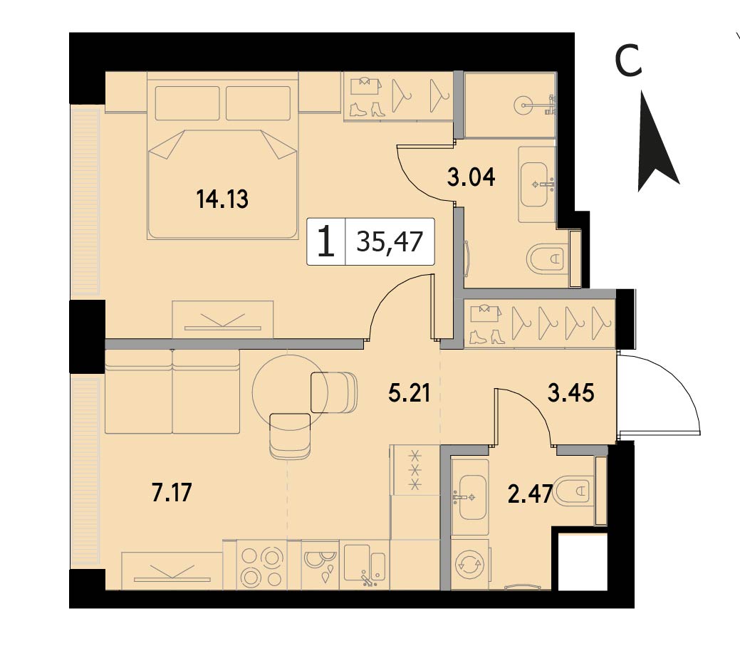 В продаже 1-комнатная квартира без отделки на 2 этаже, Корпус 1.2.