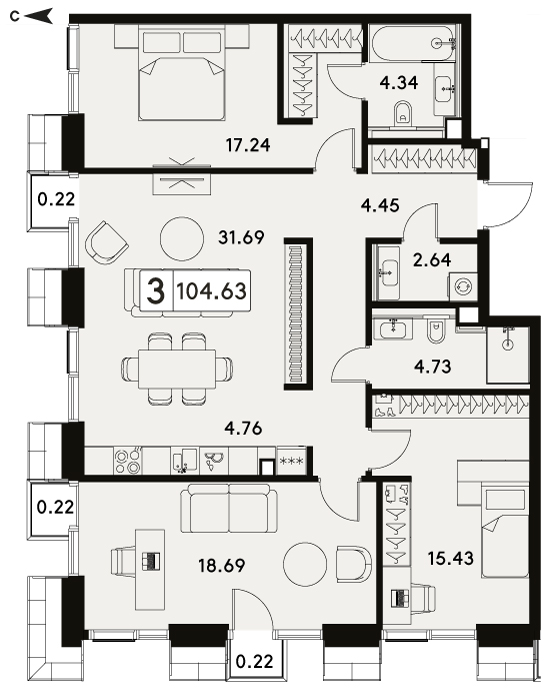 Представляем вашему вниманию 3-комнатная квартира без отделки на 14 этаже, Корпус 1.