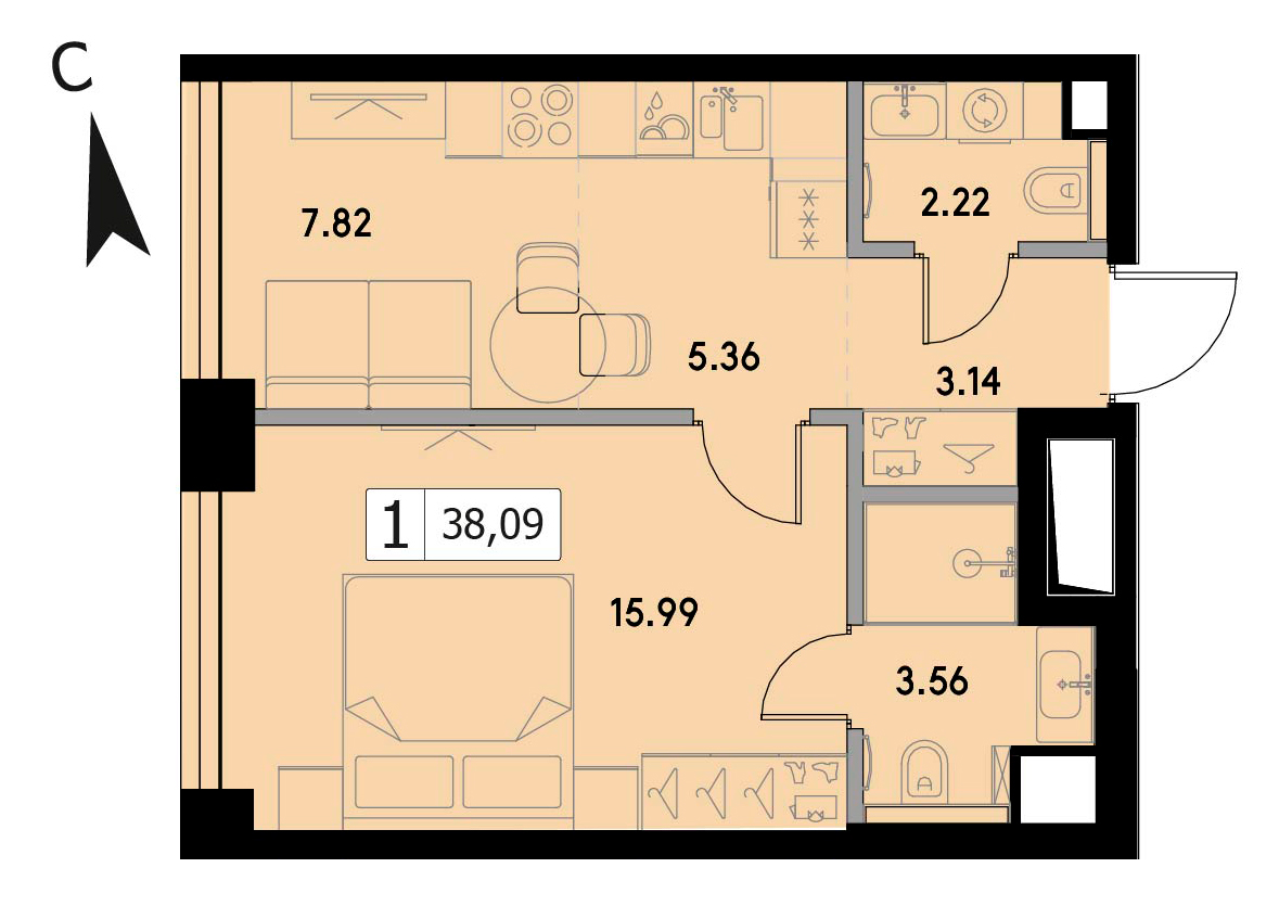 В продаже 1-комнатная квартира без отделки на 38 этаже, Корпус 1.3.