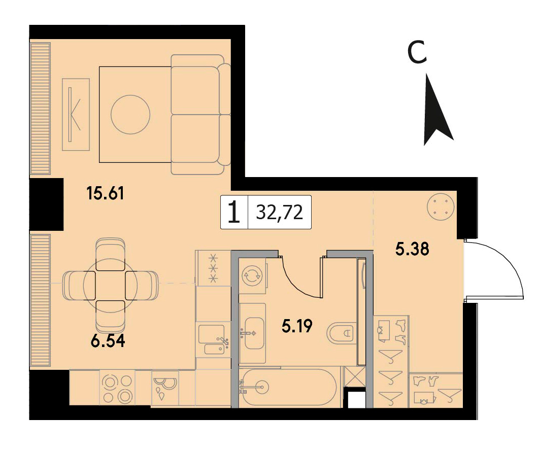 В продаже 1-комнатная квартира без отделки на 32 этаже, Корпус 1.3.